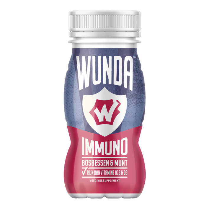 Wunda immuno is een vegan voedingssupplement shot met de heerlijke smaak van bosbessen en munt. De toegevoegde vitaminen en mineralen ondersteunen je immuunsysteem. Max. 1 shot per dag. Wunda-baarlijk klein maar machtig met vitamine b12, d3, ijzer en zink. Wunda is -van inkoop tot productieproces- co2-neutraal. Wunda is vegan gecertificeerd. Ook in de smaak mango-gember verkrijgbaar.
