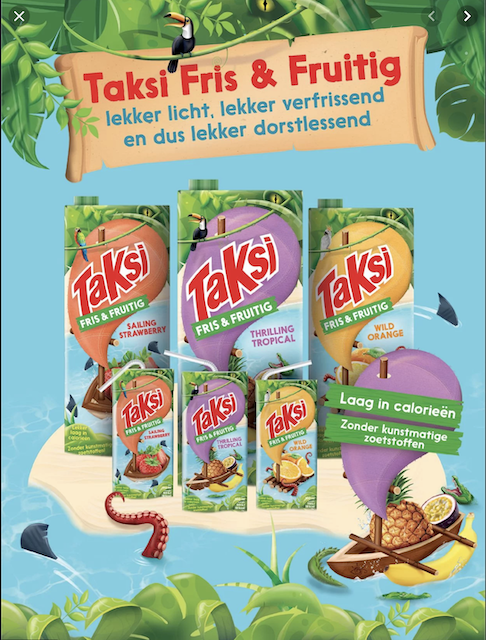 Deze nieuwe drankjes worden gemaakt van duurzaam geteeld fruit(sap) en zijn verantwoorder, luchtiger en frisser dan de traditionele Taksi-dranken. En ze zijn verkrijgbaar in grote pakken van 1,5 liter maar ook in kleine pakjes van 0,2 liter. Makkelijk om mee te nemen.