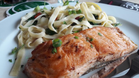 ’s Avonds hebben we bij ‘De Merckt’ gegeten in Tiel. Ik was helemaal vergeten om te vragen of de zalm die ik besteld had lactosevrij was. Omdat de meeste zalm altijd gegrild wordt. Dus had ik het toch nog maar even voor de zekerheid gevraagd, en jazeker hij kwam ook van de grill. Mmm, en lekker dat hij was.