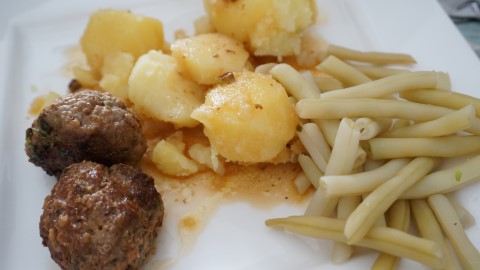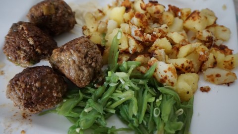 We hadden nog gekookte aardappels van gister over, en deze heb ik opgebakken in een beetje olijfolie. Snufje zout erover heen en smullen maar. Ik had nog wat SATEBALLETJES over en serveerde deze erbij met wat snijboontjes uit de diepvries. Deze had ik een paar weken geleden gekregen van mijn tante. Mmm, even gekookt in een klein laagje water.