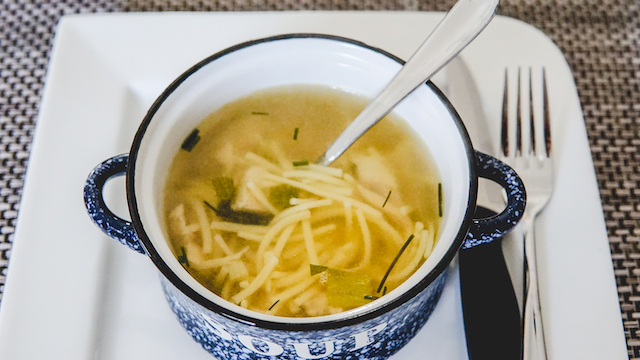 Simpel kippensoepje. Ik had een simpele bouillon gemaakt van kippen bouillonblokjes (Maggi) 2 blokjes op 1 liter water. En daaraan heb ik blokjes kipfilet en lente-ui toegevoegd. De soep heb ik aan de kook gebracht en vervolgens de vermicelli nog 10 minuten mee laten koken. Als laatste heb ik er nog wat verse fijngesneden bieslook toegevoegd. En we hadden nog een stukje plaattaart met kip kebab dus die had ik even opgewarmd in de oven (225 graden hetelucht voorverwarmd en dan 5 minuten in de oven).