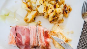 Ik had even snel wat aardappels gekookt in de micro cook van Tupperware (ik kan echt niet meer zonder dat ding haha). En toen heb ik deze aardappels even lekker opgebakken in de koekenpan. Ouderwets gebakken aardappels hoe mijn moeder ze ook altijd maakt, verrukkelijk! En daarbij had ik een koolrabi gekookt, maar dat vond ik echt niet lekker. Die had mijn moeder gekregen dus ik dacht ik ga het gewoon proberen, maar de smaak van kool overheerste te erg haha. Nee die zullen wij niet gauw meer eten. Daarbij bakte ik een zalmpje in de oven. Ik had geen spekblokjes meer dus ik gebruikte katenspek uit de vriezer. Zo simpel maar zo ontzettend lekker! Ik koop tegenwoordig verse zalm uit de koeling, hij is iets duurder maar veeeeeel lekkerder dan uit de vriezer.