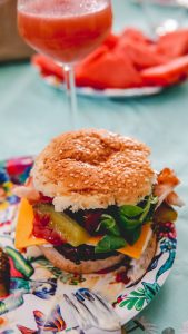 Vanavond vierden we dus de verjaardag met familie. Vanwege corona hebben we het zo klein gevierd. We haalden friet bij de cafetaria bij ons in het dorp. En mijn man bakte de hamburgers op de bbq. Ik had voor hamburgersbroodjes (Jumbo/AH), violife cheddarkaas, augurken, gebakken ei, gebakken bacon (Gourmande steaky bacon), tomaten, ui, sla, zelfgemaakte bbqsaus uit het bbqboek van Green gypsyspices. En ook een heerlijke gin met watermeloen maakte ik erbij, mmm lekker gezond haha!