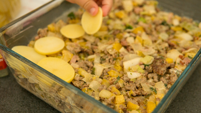 Verdeel het gehaktmengsel over de ovenschaal. Beleg met de voorgekookte aardappelschijfjes.