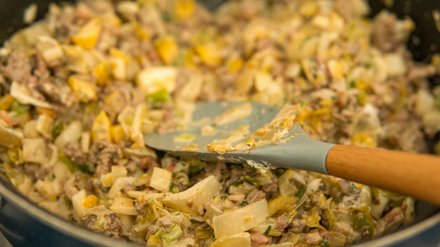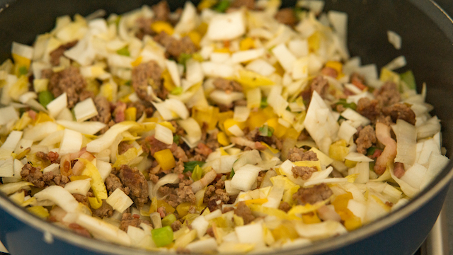 Snij de witlof door de helft en verwijder het middenstuk (deze kan bitter smaken). Vervolgens snij je de witlof fijn. Net zoals de paprika en de lente-ui (of ui). Voeg deze toe aan het gehakt en bak deze even kort mee.