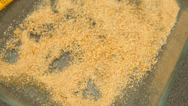 Vet de ovenschaal in met olijfolie. En verdeel op de bodem van de schaal flink wat paneermeel.