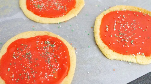 Smeer de koekjes in met de suikerglazuur. En bestrooi met de kerst spikkels (ik had ze gekocht bij Xenos).