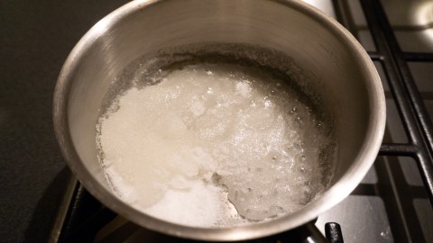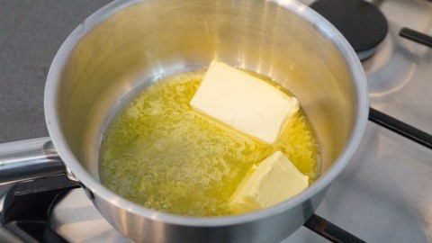 Voeg de 90 gram boter toe en laat al roerend oplossen.