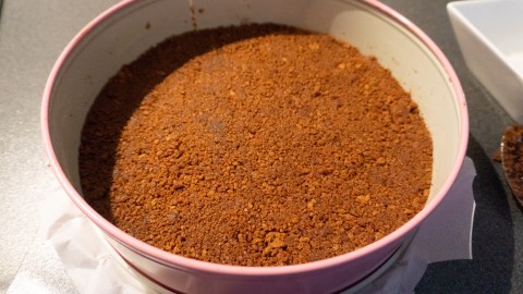 Schep de kruimels door de gesmolten boter en schep in de springvorm. Druk met de lepel aan en zet 5 min. in de koelkast.