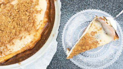 Schenk de karamelsaus over de taart en verkruimel de resterende kruidnoten erboven. Lekkere tip? Doop wat wat losse kruidnootjes in de karamelsaus en smikkel er zo van.