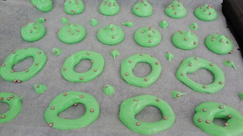 Bak de meringues ongeveer 1 uur en 30 minuten in een voorverwarmde oven tot ze droog aanvoelen en niet verkleurd zijn.