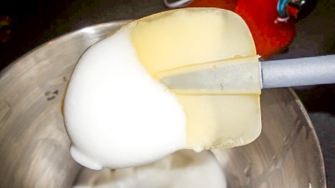 Schep er nog steeds kloppend, geleidelijk de suiker bij met één lepel tegelijk. Klop 25 seconden voordat je de volgende lepel suiker toevoegt. Blijf kloppen zolang de suiker is opgenomen. Als het mengsel nog korrelig is moet je nog even door kloppen. Als het glad en glanzend is, en het eiwitschuim blijft hangen aan een omgekeerde lepel dan