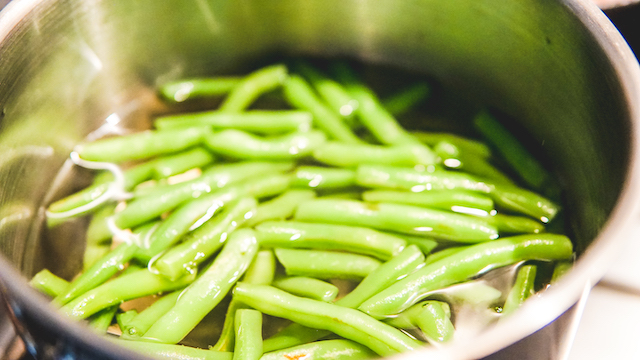 Snij je sperziebonen door de helft. En kook deze 6-8 minuten in een laagje water in een kookpan. En giet deze af.