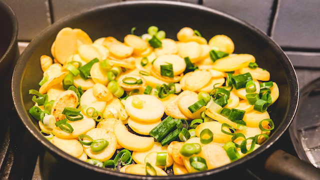 Doe een scheutje olijfilie in de hapjespan of koekenpan en laat warm worden. Bak de aardappelschijfjes even 10 minuten aan, en doe dan ongeveer 10 minuten de deksel op de pan om ze goed te laten garen. Blijf voorzichtig roeren.