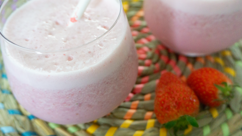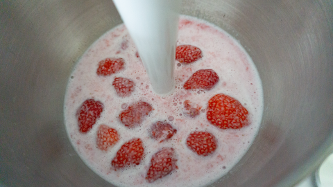 Was de aardbeien en haal het kroontje eraf. Doe de aardbeien samen met de lactosearme of plantaardige melk en de lactosearme of plantaardige yoghurt met het scheutje lemon siroop in een kom. En maak alles fijn met de staafmixer of gebruik een blender.