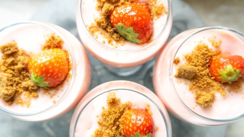 Verdeel de koekkruim over 4 glazen op de bodem en verdeel hier bovenop de mousse. En strooi er nog een klein beetje koekkruim overheen en leg er een aardbei op.