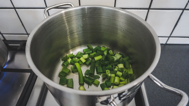 Doe de olie in een kookpan en laat warm worden. Snij de lente-ui fijn, of gebruik een kleine normale ui. En fruit deze een paar minuten in de kookpan.