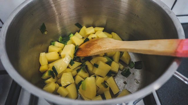 Schil de aardappels en snij in blokjes. En bak even mee met de lente-ui.