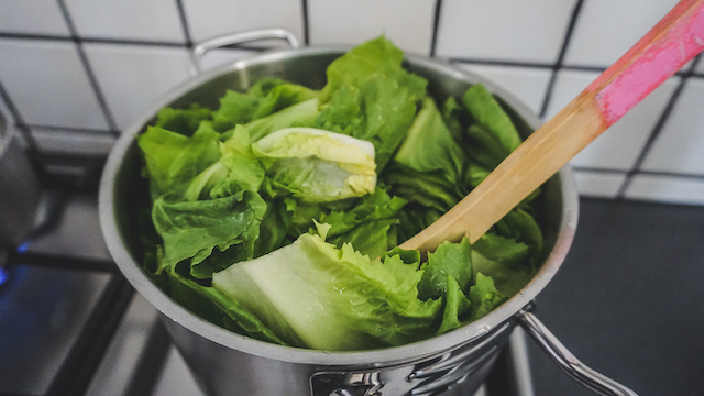 Was ondertussen de andijvie, en snij in reepjes. Voeg deze ook toe, en laat ook een paar minuten warm worden. De andijvie slinkt iets.