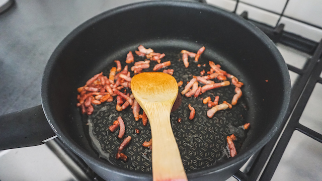 Voeg als laatste de spekjes en een scheutje lactosevrije kookroom toe. Eetsmakelijk!