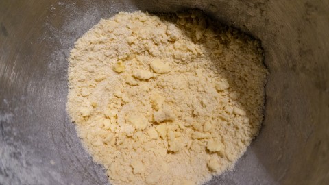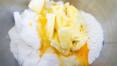 Doe de bloem, boter, basterdsuiker, ei en het snufje zout in een kom. En kneed alles met de hand tot een mooi deeg.