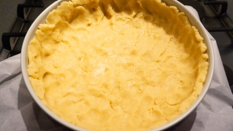 Duw met je vingers het stuk deeg op de bodem. En duw het deeg ook tegen de zijkant van de springvorm.