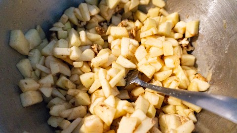 Pel de walnoten of gebruik kant en klaar gepelde walnoten en roer door de appels. En verdeel de appels met de walnoten nu over de bodem.