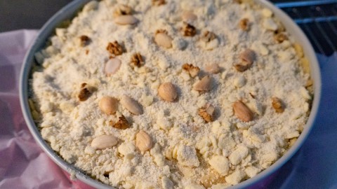 Verdeel deze over de appels. En strooi daar overheen nog wat amandelen en walnoten.