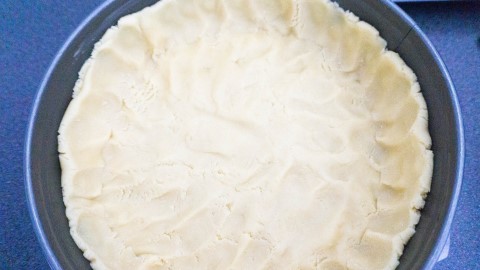 Duw met je vingers één stuk deeg op de bodem. En duw het tweede stuk deeg tegen de zijkant van de springvorm.