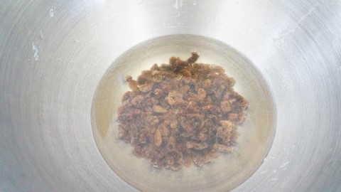 Kook wat water in de waterkoker, en laat even afkoelen. Doe de rozijnen in een schaaltje en voeg het wat afgekoelde warme water toe en laat ze ongeveer 5 minuten staan, ondergedompeld in het water.