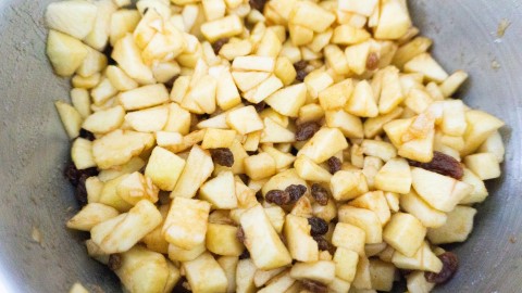 Snij de appels in kleine stukjes en doe die vervolgens in een schaal. En giet er wat citroensap overheen zodat ze niet erg bruin worden. Voeg nu de suiker, vanillesuiker, rozijnen en kaneel toe. En roer alles goed door elkaar.