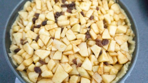Zet de appeltaart voor ongeveer 55 minuten in de oven en bak mooi goudbruin. Laat afkoelen, en snij in stukken.