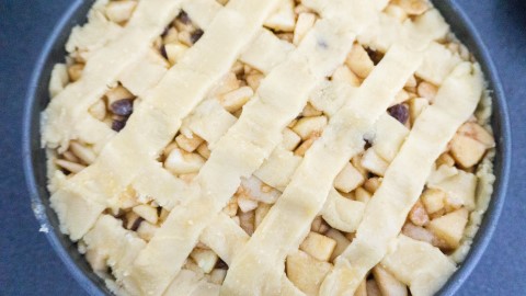 Maak nu mooie slierten van het over gebleven deeg voor op de appeltaart. Wat ik persoonlijk fijner vind is dat je wat bloem op je aanrecht strooit, daar je laatste stuk deeg op legt. En uitrolt met de deegroller, en dan snij je er heel gemakkelijk mooie slierten van. Je kunt de slierten er eerst verticaal op leggen en vervolgens horizontaal eroverheen. Je kunt het raster ook vlechten, dat geeft ook een heel mooi resultaat. Bestrijk nog met het beetje ei wat over is door middel van een kwastje.