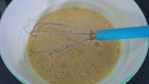Voeg de eieren en de honing toe. Roer alles even goed met de garde door elkaar.