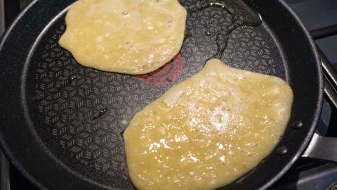 Doe een beetje lactosevrije boter in de koekenpan en voeg 2 (jus) lepels beslag in de pan, als je een grote koekenpan hebt kun je er ook 4 tegelijk bakken.