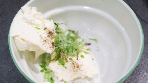 Pers een teentje knoflook uit of snij deze fijn. Meng de roomkaas met een handje verse of gedroogde bieslook, teentje knoflook in een schaaltje en voeg een snufje zout en peper toe. En roer even door.