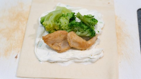 En smeer in het midden op het velletje bladerdeeg de zelfgemaakte lactosevrije kruidenroomkaas. Leg daarboven op wat broccoli en stukjes kip.