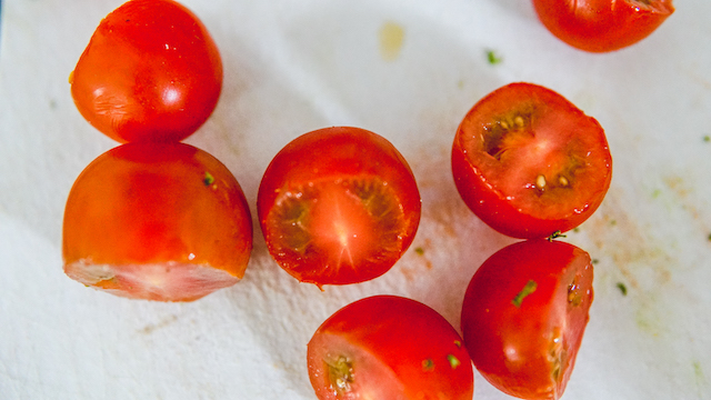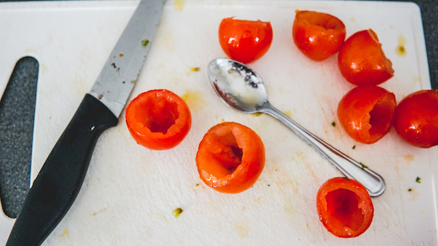 Snij de bovenkant van de cherrytomaatjes eraf met een scherp mes.