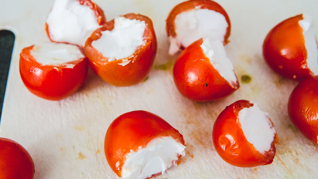 Vul de cherrytomaatjes met een theelepel roomkaas.