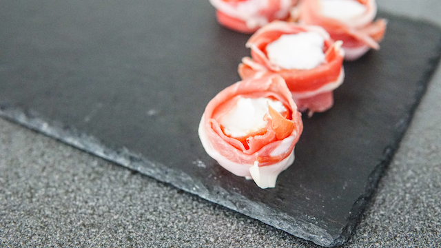 Snij de serranoham in de lengte door de helft. En rol om de cherrytomaatjes heen.