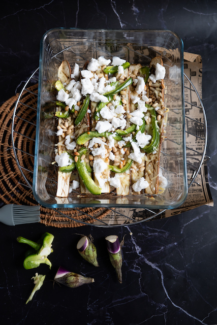 Haal de Chinese aubergine uit de oven en verkruimel met je handen de plantaardige feta eroverheen.