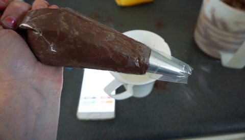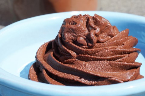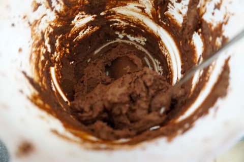 Klop de slagroom stijf met de mixer. Zodra deze bijna stijf is voeg je telkens een klein beetje cacaopoeder toe, en mix tussendoor.