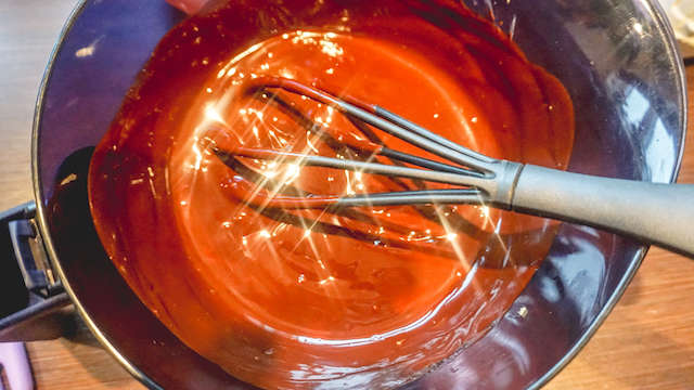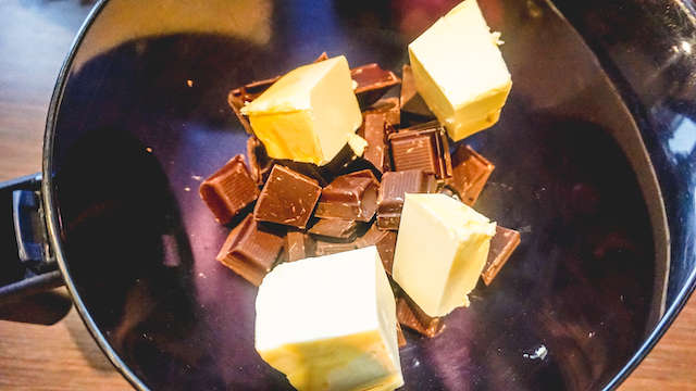 Doe in een steelpan en laat smelten, of smelt het in de magnetron op 600 watt en roer elke 25 seconden de chocola en de boter even door en herhaal dit totdat de chocola gesmolten is.