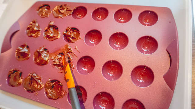 Je kunt het ook in kleine vormpjes scheppen zoals wij gedaan hebben, om vieze handen te voorkomen. En dan zet je de vorm in de koelkast.