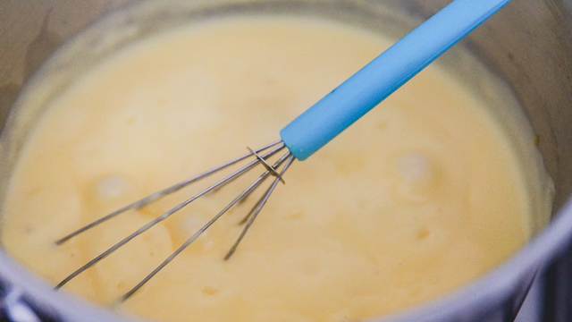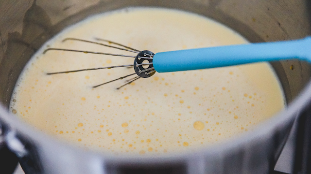 Voeg het custard mengsel al roerende toe aan de hete lactosevrije melk.