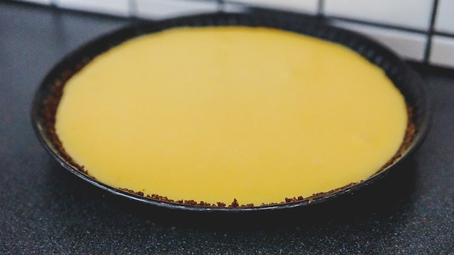 Druk de kruimels in de vorm met een lepel. Maak een randje erlangs. En zet de bodem in de koelkast om af te laten koelen.