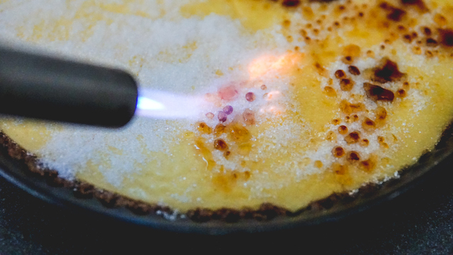 Voor het opdienen snij je de taart in stukjes en bestrooi deze met suiker of rietsuiker en verhit de suikerlaag met een crème brûléebrander tot de suiker karamelkleurig wordt. Kijk uit dat het niet verbrand. En serveer de taart direct.
