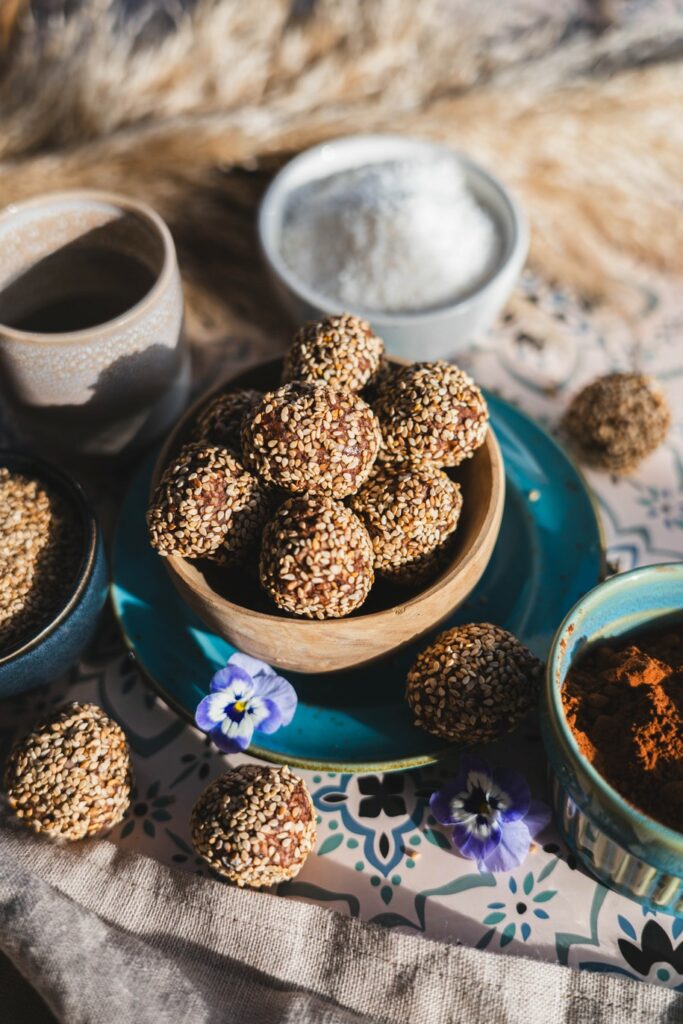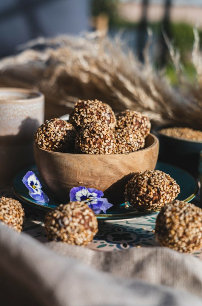 Dit recept is voor ongeveer 25 dadelballetjes met sesamzaad.