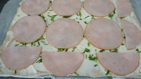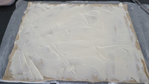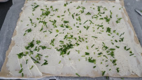 Rol de pizzadeeg uit op het papier waar het in ligt, leg de brede kant voor je en besmeer met de lactosevrije roomkaas.
