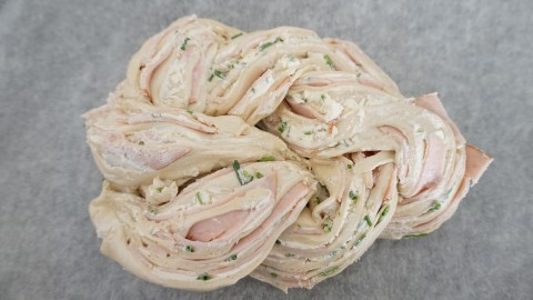 Beleg daarna met de kipfilet en rol voorzichtig op en leg weer in het papier .